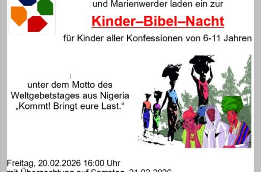 Die Gemeinden der Region Garbsen-Süd und Marienwerder laden ein zur Kinder–Bibel–Nacht für Kinder aller Konfessionen von 6-11 Jahren unter dem Motto des Weltgebetstages aus Nigeria „Kommt! ...