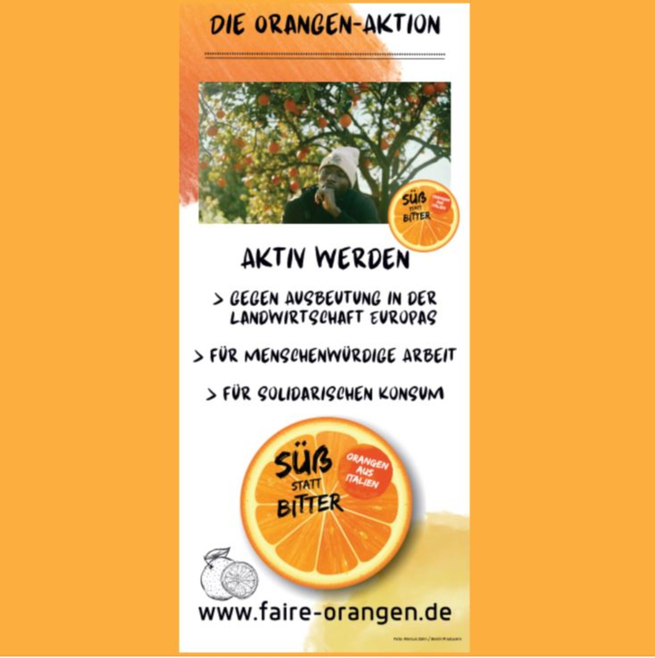 Wir beziehen die in Kalabrien unter ökologischen Bedingungen angebauten und von legal beschäftigten Migranten geernteten Früchte ohne Zwischenhändler. Der Gewinn fließt zum überwiegenden Teil zurück an Mediterranean Hope (MH), dem Geflüchtetenprogramm der Föderation Evangelischer Kirchen in Italien. Es ist beeindrucken, wie sich MH gegen die Unsichtbarkeit der Migranten (Orangenpflückarbeit ist Männerarbeit) und das Wegsehen Europas einsetzt. Ebenso ist es beeindruckend, wie sich die Orangenaktion innerhalb von 5 Jahren in Deutschland entwickelt hat. Zuletzt waren Mitarbeiterinnen von MH auf dem Kirchentag in Hannover, um dort von ihrer Vereinsarbeit bei „SOS Rosarno“ zuberichten. (Eine Gruppe von Aktivisten, Landwirten und Tagelöhnern gründeten diesen Verein, um Migranten mit regulären Arbeitsverträgen, Tariflöhnen sowie Sozialbeiträgen zu beschäftigen. Der Verein organisiert den direkten Verkauf an Bioläden und Gruppen, die aus solidarischen Konsument*innen bestehen.) So gelingt es, gerade im Kontext von kirchlicher Eine-Welt-Arbeit, Ungerechtigkeit beim Namen zu nennen und sich für menschenwürdige Lebensbedingungen einzusetzen.