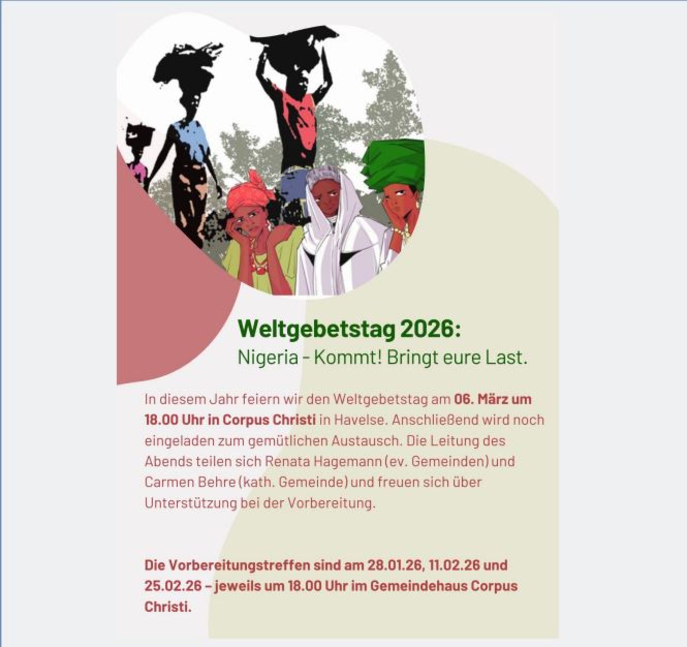 Die Liturgie für den Weltgebetstag 2026 kommt aus dem westafrikanischen Nigeria. Er wird am Freitag, den 6. März rund um den Globus gefeiert und trägt den Titel: „Kommt – Lasst euch stärken!“, einer Kurzfassung des bekannten Bibelwortes Jesu «Kommt her zu mir, alle, die ihr mühselig und beladen seid; ich will euch erquicken» (Mt 11,28).Unsere nigerianischen Schwestern aus verschiedenen geografischen und sozialen Kontexten erzählen im Gottesdienst von ihren alltäglichen Belastungen und Traumata auf körperlicher, emotionaler und spiritueller Ebene und wie sie im Glauben «Ruhe und Kraft für die Seele» finden. In der gesamten Liturgie ist zu spüren, wie intensiv und lebendig in Nigeria Gottesdienste gefeiert werden. Oft ganz anders als bei uns!
