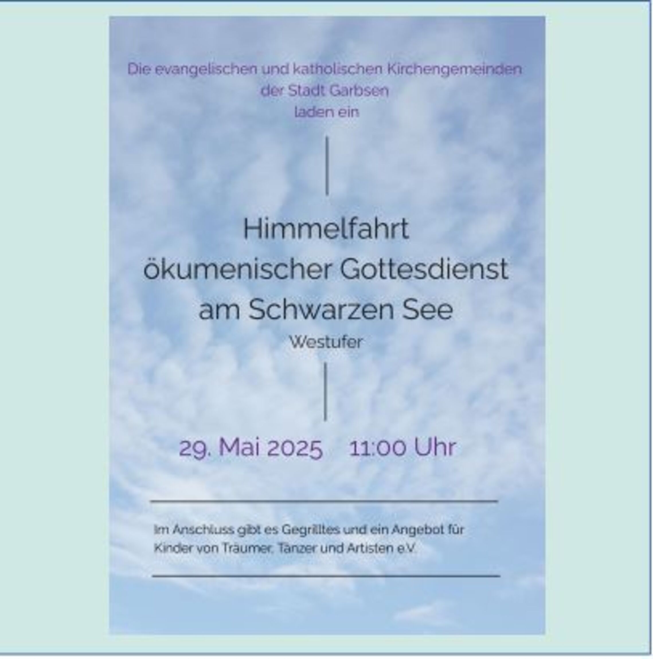 Nach langer Pause haben sich die evangelischen und katholischen Gemeinden in Garbsen am Donnerstag, 29. Mai 2025, 11:00 Uhr wieder verabredet zu Himmelfahrt einen gemeinsamen ökumenischen Gottesdienst am Schwarzen See zu feiern.