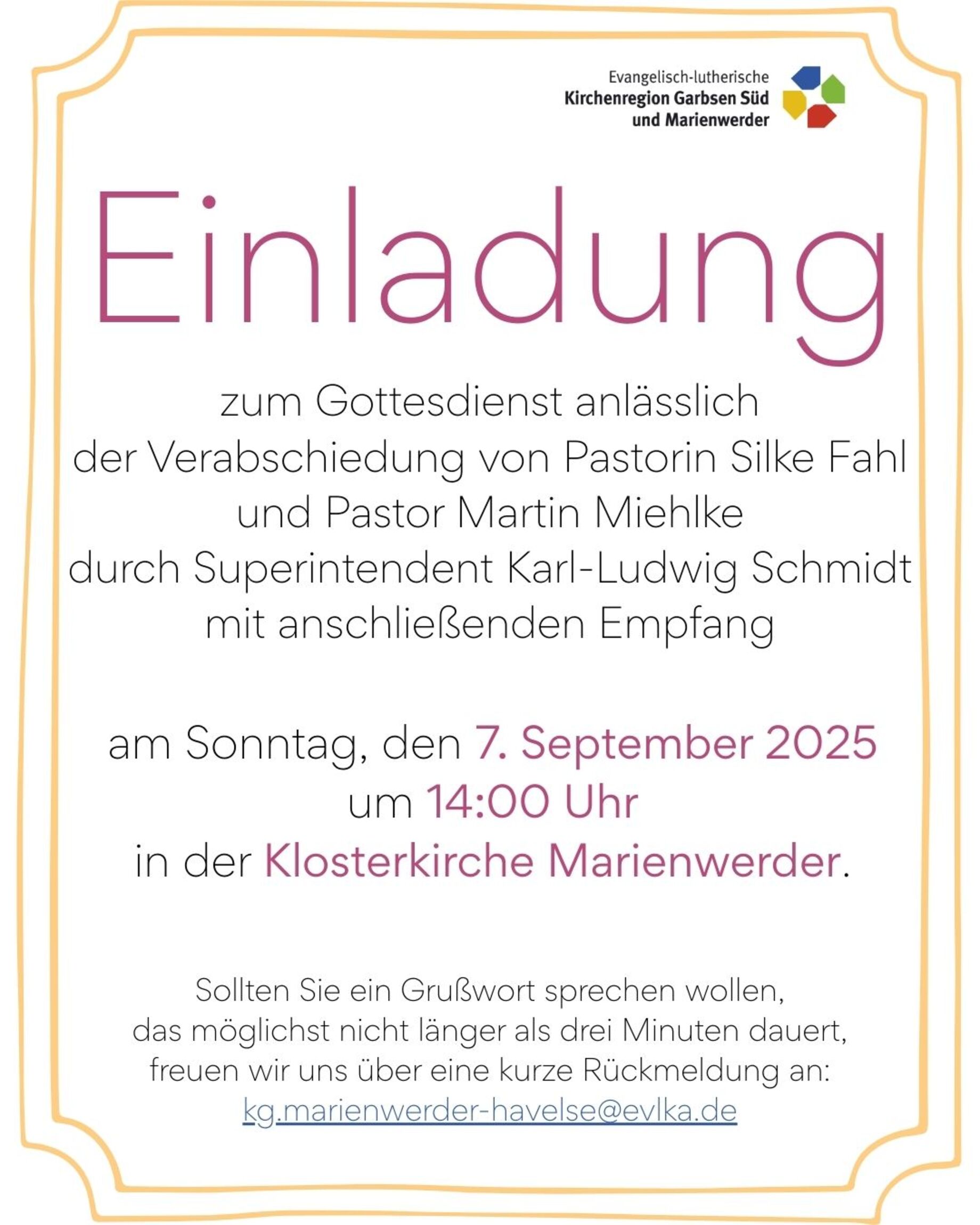 wie Sie und ihr ja vermutlich bereits.wisst, werde auch ich die Kirchengemeinde Alt-Garbsen und die Kirchenregion Garbsen-Süd und Marienwerder verlassen.