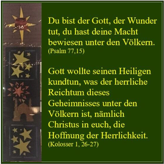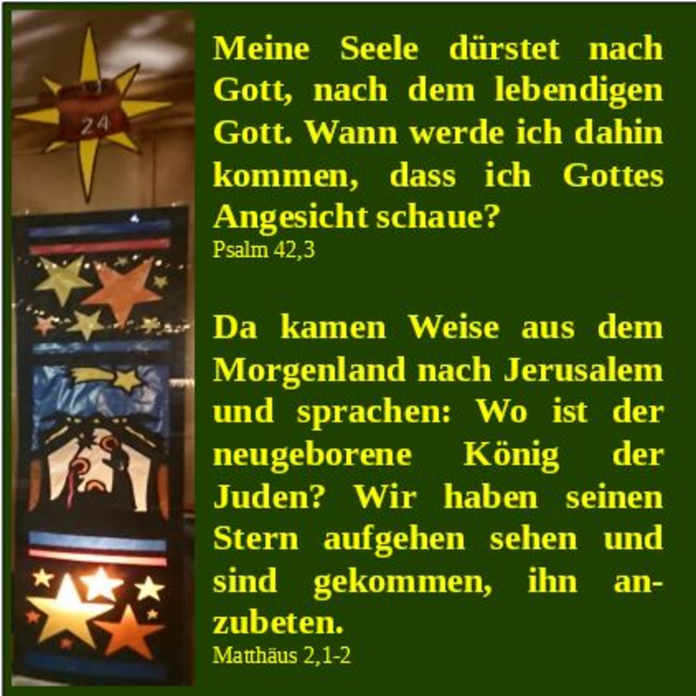 Da kamen Weise aus dem Morgenland nach Jerusalem und sprachen: Wo ist der neugeborene König der Juden? Wir haben seinen Stern aufgehen sehen und sind gekommen, ihn anzubeten.