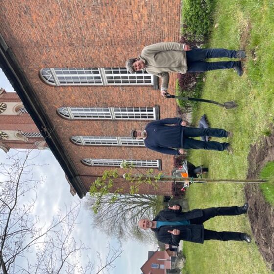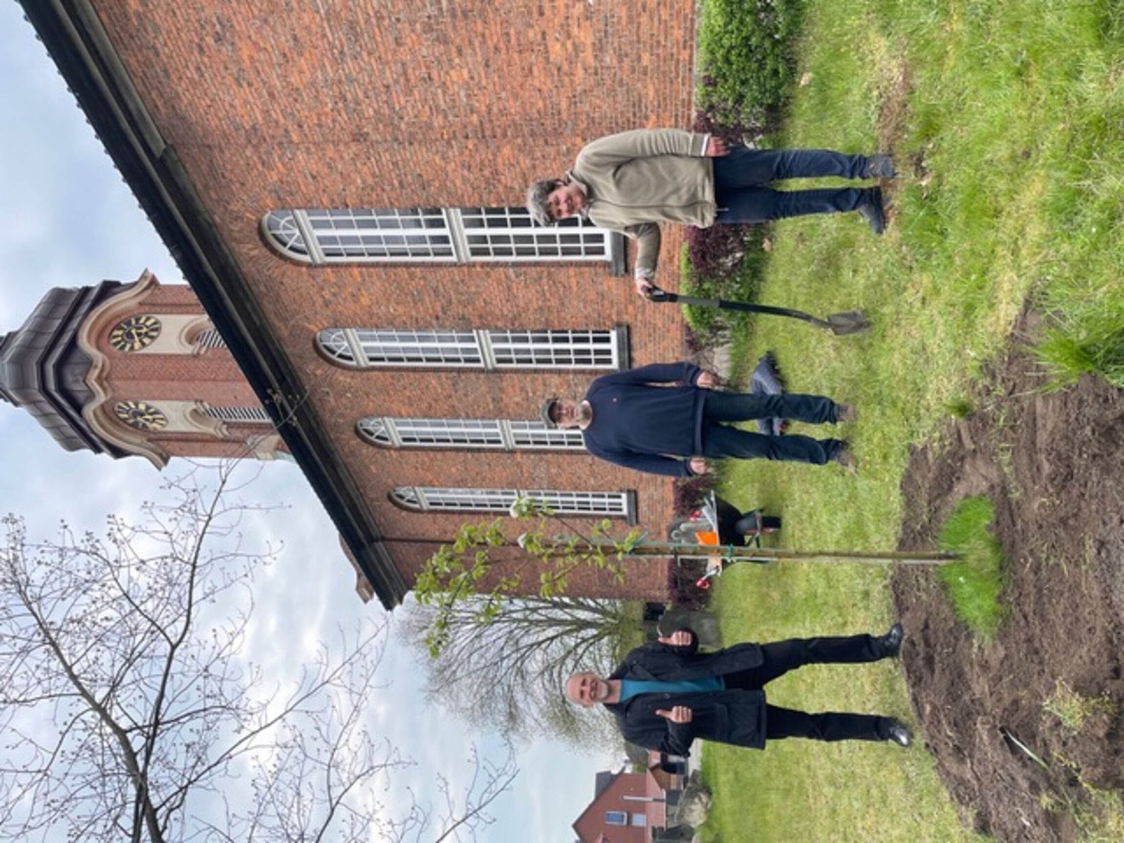 Gesagt getan- und so haben Hannes Miezal und Familie Koch einen Apfel- und einen Birnenbaum an den Garten an der Kirche gepflanzt. Die Bäume stammen aus dem Nachlass von Ursel und Günter Kottas, die der Gemeinde sehr eng verbunden waren. Wir als Gemeinde möchten uns mit diesen Bäumen an die beiden erinnern. Nach getaner Arbeit hat Christiane Fröhling die Schilder mit den Namen an den Bäumen befestigt.