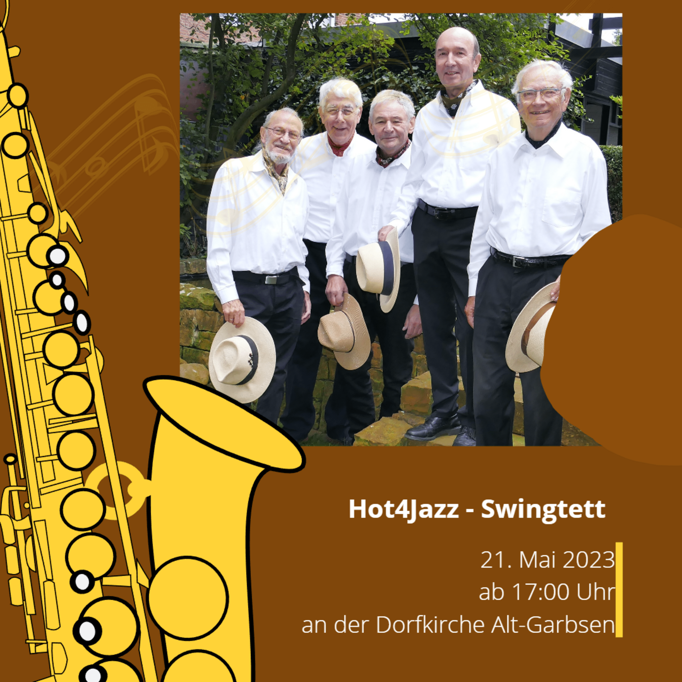 Am 21.05. tritt das Hot4Jazz - Swingtett ab 17.00 Uhr bei gutem Wetter Open-Air vor der Dorfkirche Alt-Garbsen auf, sonst darin. Aus der bekannten Jazz-Band wurde - mit einer veränderten Besetzung - das Hot4Jazz-Swingtett. Statt Dixieland wurden jüngere Titel aus dem American Songbook in das Programm aufgenommen. Swing weckt Erinnerungen. Lädt ein, einfach die Seele baumeln zu lassen. Hot4Jazz: „Als Amateurmusiker freuen wir uns besonders an dieser Erfahrung teilhaben zu dürfen und die damit verbundene Freude weiterzugeben“.