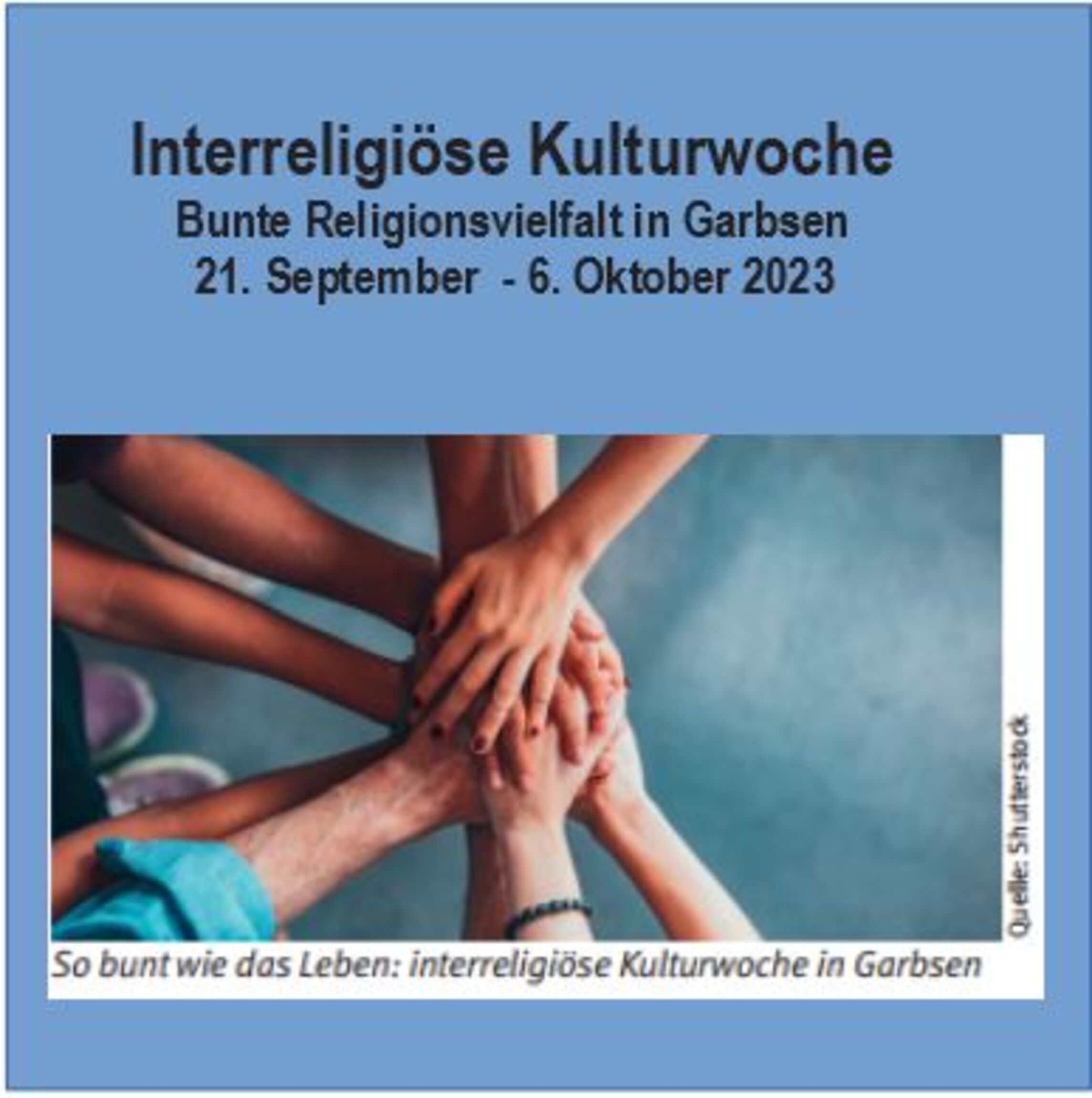 Vom 21. September bis zum 6. Oktober 2023 finden in Garbsen die zweiten Interreligiösen Kulturwochen statt, ebenfalls mit einer Ausstellung im Rathaus und unterschiedlichen Einladungen der Religions- und Glaubensgemeinschaften an verschiedene Orte.