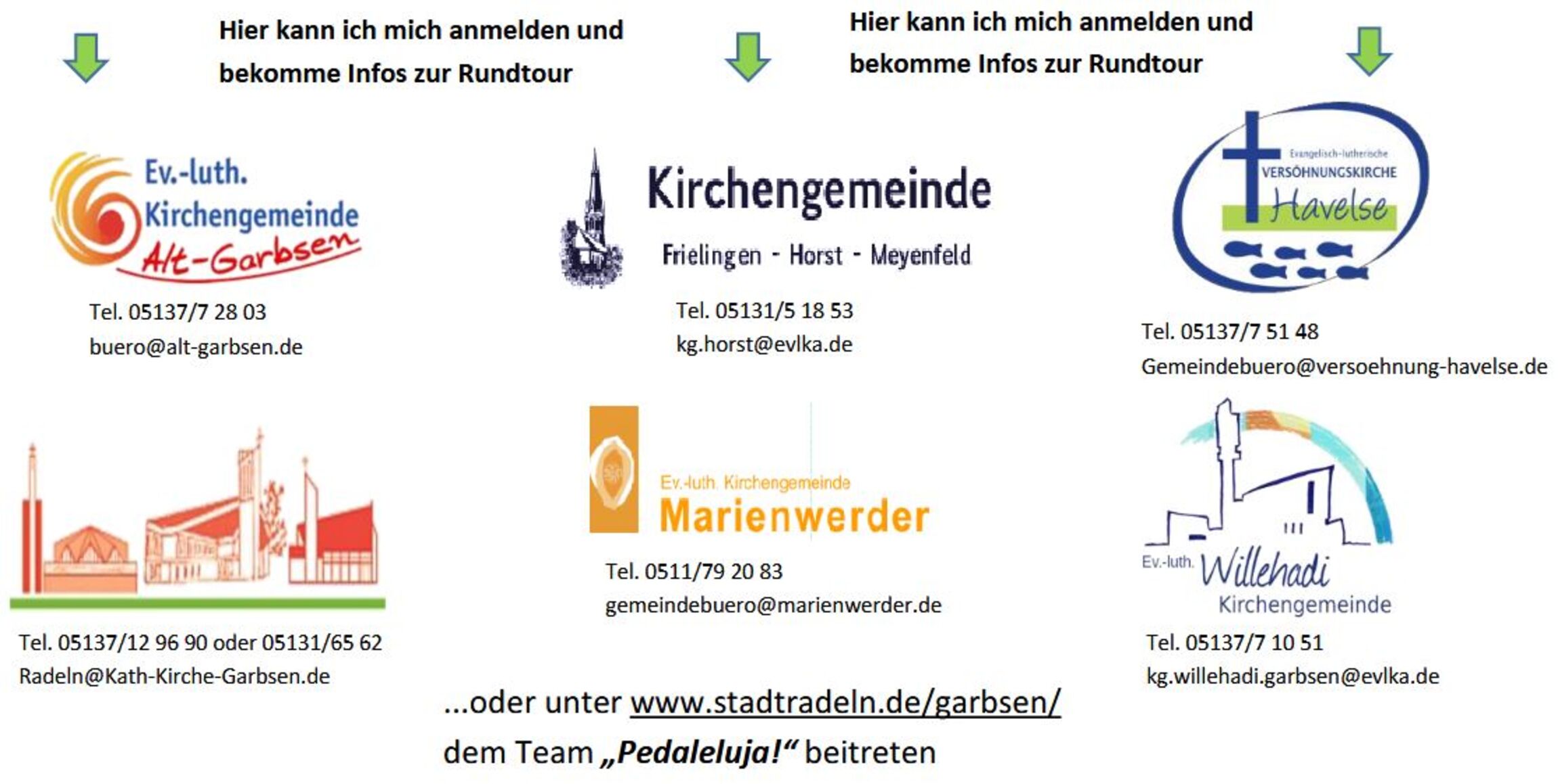Wir freuen uns, wenn Du uns tatkräftig unterstützt und einer der drei Gruppen Pedaleluja!, Kirche mit Rad und Tat oder St. Raphael radelt unter www.stadtradeln.de/garbsen beitrittst oder die gefahrenen Kilometer auf einem Zettel notierst und am Ende der Aktion in einem der Gemeindebüros abgibst.