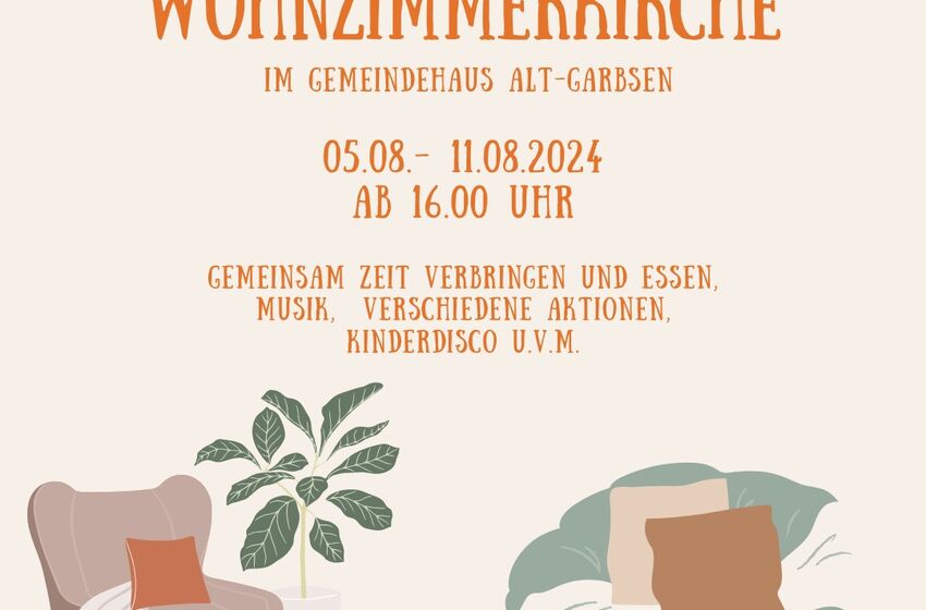 Vom 5.8.-11.8.2024 wollen wir gemeinsam Wohnzimmerkirche im Gemeindehaus Alt-Garbsen feiern. Jeden Tag von 16.00 Uhr bis 22.00 Uhr (am Wochenende schon ab 9.00 Uhr) ist das Gemeindehaus geöffnet ...